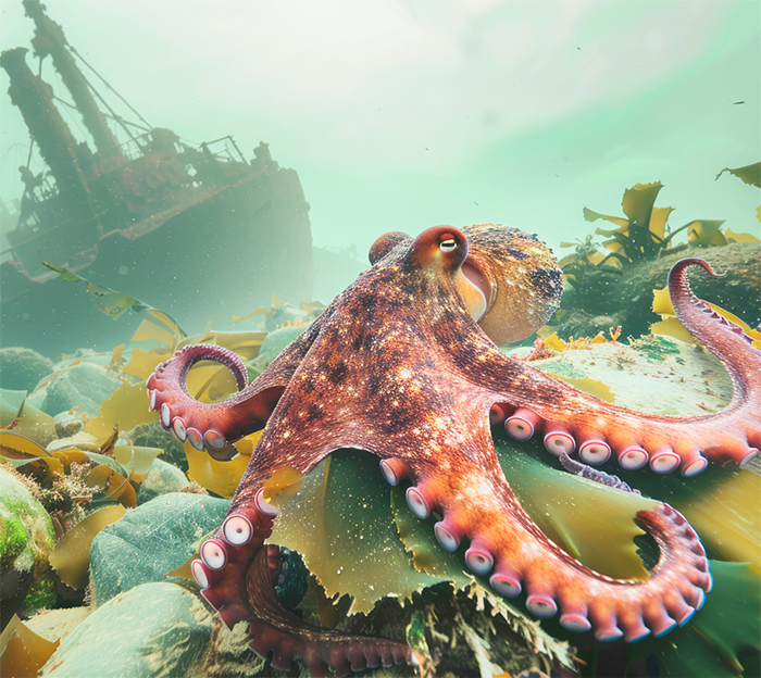 Des expériences ont démontré sa capacité à résoudre des problèmes, à mémoriser des situations, à reconnaître des individus et même à utiliser des outils simples. Curieux et joueur, le poulpe explore son environnement avec une étonnante finesse et manifeste des comportements suggérant des formes de plaisir, de stress ou de détresse.