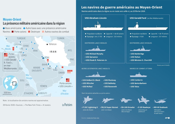 | Moyens (Means) | • 2 groupes aéronavals (GAN) autour de 2 porte-avions: sécurisation du détroit d’Ormuz (infographie: La présence militaire américaine dans la • Bases américaines pré-positionnées dans la région • Appel au soulèvement du peuple iranien par des opérations clandestines | • Force aérospatiale du corps des Gardiens de la révolution • Marine: bloquer le détroit • Contrôle de la population: manifestations / tentative sécessionniste de toute minorité (kurde...) / Pas d’apparition d’une alternative politique «transitionnelle» |