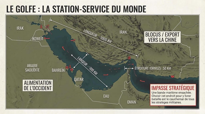 [3] Bloquer le détroit d’Ormuz (infographie: le Golfe, la station-service du monde): c’est devenu une arme de guerre car le détroit possède une capacité de nuisance sur 20% du trafic maritime mondial en dissuadant les navires, avec en filigrane une crise pétrolière possible à long terme (infographie: Géopolitique & Marchés).