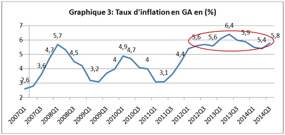 Le niveau des taux d’inflation en 2011 était compatible avec le niveau historique moyen et le souci majeur de l’institut d’émission était de fournir la liquidité nécessaire au système bancaire pour lui permettre de financer l’économie. Ce n’est qu’au début de 2012 que l’inflation commence à devenir un sérieux problème pour l’autorité monétaire en atteignant un niveau de 6% en 2013. Les neufs premiers mois de2014, l’inflation s’établit à 5,6% contre 5,8% pour la même période en 2013. Toutefois, il semble que cette inflation soit plus une résultante d’une inadéquation entre offre et demande de biens et services et de la politique de dépréciation du dinar, que d’origine monétaire. En effet, des perturbations au niveau des canaux de distribution, la dépréciation du dinar vis-à-vis de l’euro et du dollar auxquelles s’est ajouté l’effet retardé de la progression exceptionnelle des salaires, semblent avoir un impact sur les taux d’inflation.Le creusement du déficit budgétaire (de 5,2% du PIB en 2012 à 6 ,9% 2013), conjugué à l’augmentation des prix internationaux de l’énergie et de certains produits de base, ont incité l’Etat à introduire des ajustements sur les prix de certains produits administrés, notamment depuis le quatrième trimestre 2012, contribuant ainsi à mettre la pression sur les prix.
