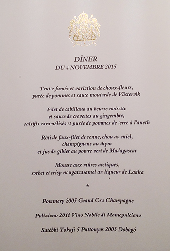 Mieux vaut vous laisser imaginer ce qui fera enivrer vos papilles. Entrée : truite fumée et variation de choux fleurs, purée de pommes et sauce moutarde de Västervik. Premier plat : filet de cabillaud au beurre noisette et sauce de crevette au gingembre, salsifis caramélisés et purée de pomme de terre à l’aneth. Deuxième plat : rôti de faux-filet de renne, chou au miel, champignon au thym et jus de gibier au poivre vert de Madagascar. On arrive au dessert : mousse aux mûres arctiques, sorbet et crisp nougat caramel à la liqueur de Lakka. Le tout arrosé de Pommery 2005 Grand Cru Champagne (ou non alcoolisé), Poliziano 2011 Vino Nobile di Montepulciano et Satöbbi Tokaji 5 Puttonoyos 2003  Dobogo.