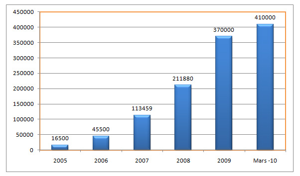 | Année | 2005 | 2006 | 2007 | 2008 | 2009 | Mars 2010 |