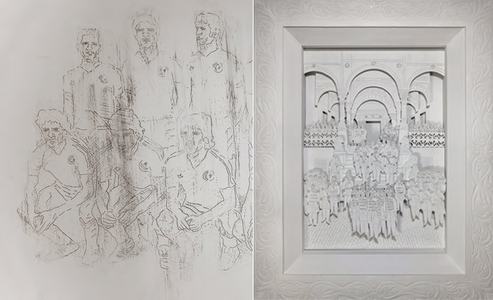 A travers 24 œuvres Peintures, bas reliefs (1), Senda Belhassan propose dans une non-couleur, un voyage à travers le chantier identitaire national : une quête de la tunisianité ou les blancs sur blancs théâtralisent les lieux d’une mémoire commune refoulée par des cassures historique. Un SAS de neutralité au milieu du « trop plein » de questionnements identitaires, parfois agressifs. Face au trop de mémoire, au trop d’oubli et à l’explosion des replis identitaire, Senda belhassen offre une ouverture, à travers des vides, des ombres, des espaces et creuse les icônes sans les détruire, sans commémorations ni jugements. Une démarche interactive ou le public interroge l’icône dans sa transformation matérielle.