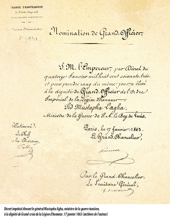 Malheureusement, l’époque n’était guère propice à la réalisation des grands desseins. Napoléon III incarna avec grandeur l’arabophilie française mais son règne coïncida avec le moment le plus agressif de l’expansion européenne, c’est-à-dire celui du harcèlement des Etats orientaux par les requins de la finance. Dans un tel contexte d’opérations usuraires et d’intrigues, il ne restait guère de place aux idées généreuses de l’Empereur. Entre Napoléon III et la Tunisie se dressa le barrage des spéculateurs et des prévaricateurs. Les manœuvres de ce qu’un pamphlétaire, Gabriel Hugelmann, avait appelé «les secrétariats de la rue Bergère et les consulats de la rue Taitbout» (par allusion au Comptoir d’Escompte et au banquier Erlanger installés dans ces deux rues de Paris) n’allaient certes pas dans le sens d’un rapprochement entre les peuples. Il faut garder présent à l’esprit la férocité de cette période précoloniale pour imaginer ce qu’aurait pu, ce qu’aurait dû être, dans un autre contexte, les relations entre les deux Etats. Mais malgré tout, la dynastie tunisienne avait senti ce que les idées de l’Empereur avaient de grand et de généreux. Aussi, les beys husseïnites n’ont cessé d’entretenir le souvenir de l’amitié impériale. Dans la grande salle du trône du Bardo, jusqu’à l’abolition de la monarchie en 1957, se trouvaient en bonne place deux portraits de Louis-Napoléon Bonaparte : un tableau équestre du prince-président et un superbe portrait en pied de l’Empereur dans un cadre surmonté des armes impériales et comportant la dédicace : «Napoléon III à Sadak (sic) pacha bey de Tunis». A ces deux portraits s’ajoutait un splendide tableau, œuvre du peintre grenoblois Debelle, représentant, au moment du départ du prince tunisien, l’Empereur et le Bey à cheval se serrant la main et entouré des dignitaires français, la poitrine barrée du grand cordon de l’Iftikhâr et des dignitaires beylicaux décorés de la Légion d’honneur. Ce tableau qui illustre si bien la vieille amitié franco-tunisienne est aujourd’hui un des fleurons des collections historiques de l’Etat conservées au palais de Kassar-Saïd. De manière plus nette, les beys exprimèrent jusqu’à la fin leur fidélité au souvenir de l’Empereur. En effet, à partir de 1881, alors même que les résidents généraux, dépositaires des pouvoirs de la République, remettaient aux beys, lors de chaque investiture, la plaque à l’effigie de Marianne, les monarques tunisiens ne cessèrent d’arborer sur leur grand uniforme les insignes de Grand-Croix de la Légion d’honneur aux armes de l’Empire, décernée par Napoléon III à Sadok Pacha Bey lors de la rencontre d’Alger. Les hauts fonctionnaires du protectorat eurent l’élégance de ne pas s’en froisser, se conformant, en la matière, à une certaine idée de la France, celle-là même qui, aujourd’hui encore, est chère aux élites tunisiennes et dont l’illustre précurseur fut Napoléon III..
