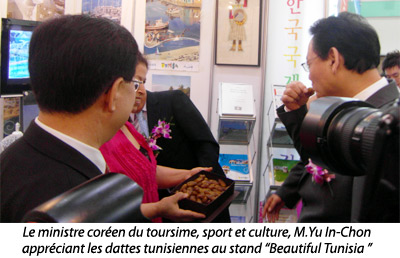 Le ministre coréen du Tourisme, Sport et Culture, M. Yu In-Chon a visité le stand tunisien avec les principaux dirigeants du tourisme coréens et a, lui aussi, apprécié les dattes et le “Makroudh ”. Il était accompagné de nombreux journalistes et reporters de la presse coréenne écrite et TV.