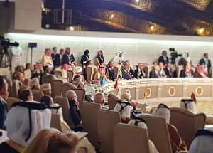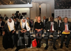 Les dirigeants des cinq grandes organisations (ONU, UE, AU, OCI et Parlement arabe) sont installés à la droit du podium de présidence, par ordre de prise de parole, un pupitre étant tout près. Derrière eux prennent place les secrétaires généraux adjoints de la Ligue arabe et certains hauts fonctionnaires de l’organisation.