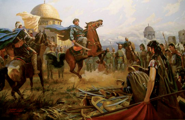 • 638 : Le calife Omar annexe les territoires palestiniens, y compris Jérusalem, qui devient ainsi un lieu sacré de l’Islam (c’est de Jérusalem que Mohamed a fait son ascension au paradis). Juifs et Chrétiens étaient autorisés à rester dans Jérusalem.