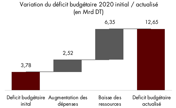 Par Férid Ben Brahim (AFC), et Mehdi Dhifallah - Dans une année durement marquée par la pandémie du Covid 19 et qui a engendré une récession économique sans précédent, la loi des finances complémentaire 2020 discutée en novembre 2020 vient actualiser les comptes de l’Etat. Les ajustements apportés par cette loi au budget initial sont exceptionnels par leur ampleur. Les dépenses totales passent de 47,23 milliards de dinars dans le budget 2020 initial à 49,71 milliards de dinars dans le complémentaire, soit une expansion de 2,52 Milliards de dinars. Le déficit budgétaire est, quant à lui, passé de 3,78 Mrd (-3% du PIB) à 12,65 Mrd (-11,4% du PIB).