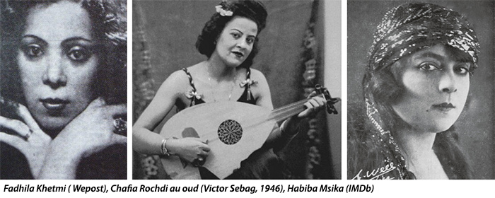 L’émancipation et la promotion sociale par les arts constituèrent, dès les années 1920, un autre aspect de l’évolution de la condition féminine. Des femmes, dont certaines étaient d’origine rurale, réussirent brillamment à Tunis et même au-delà, en Egypte et au Maghreb, grâce à la musique et au théâtre, voire au cinéma. Des noms comme ceux de Fadhila Khetmi (1905-1992),Chafia Rochdi (1910-1989), Hassiba Rochdi (1918-2012), la grande Saliha (1914-1958), pour ne citer que ceux-là, étaient autant de symboles d’un succès féminin salué par tous. Bien que cet article soit consacré à la situation des femmes musulmanes, comment ne pas mentionner, à ce propos, le phénomène considérable que constitua l’immense popularité dont fit l’objet Habiba Msika, belle et talentueuse chanteuse et comédienne de confession juive, jusqu’à sa mort tragique survenue en février 1930.
