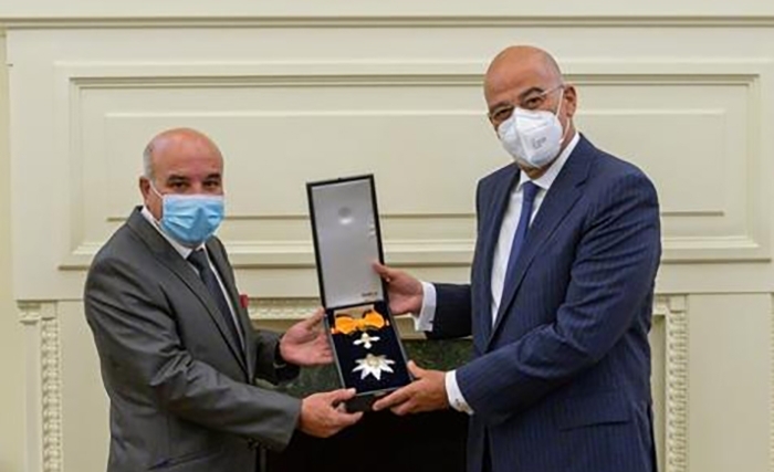 Le ministre grec des Affaires étrangères Nikos Dendias aremis La Grande Croix de l'Ordre du Phoenix à l'ambassadeur de Tunisie à Athènes Lassaad M'hirsi pour sa contribution au renforcement et au développement des relations tuniso-grecques pendant son mandat en Grèce.