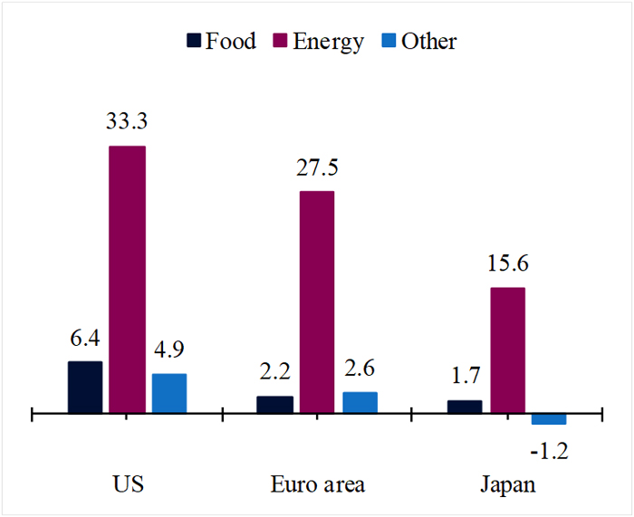 La combinaison d'une croissance soutenue de la demande mondiale et de contraintes d'approvisionnement en biens et services liées à la pandémie a entraîné une hausse significative des prix à la consommation. En fait, l'inflation mondiale, mesurée par l'indice des prix à la consommation (IPC) de l'Organisation de Coopération et de Développement Economiques (OCDE), a grimpé de 5,8 % en glissement annuel (g/a), un taux jamais atteint depuis des décennies. Il est important de noter que la plupart des économies avancées, à l'exception du Japon, connaissent une inflation rapide (voir les graphiques I et II).