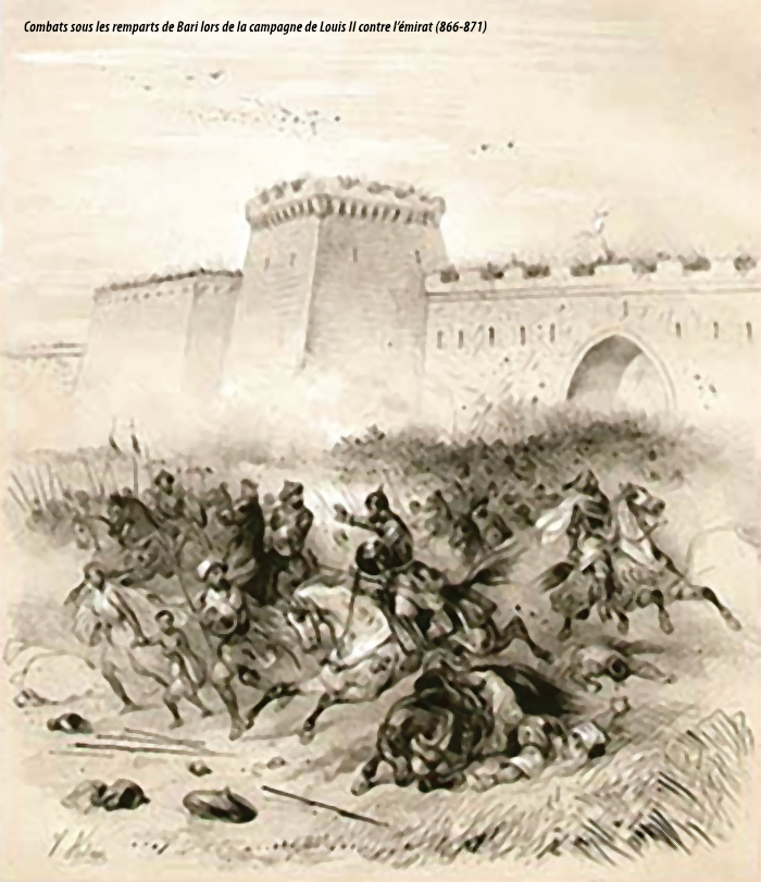 Toujours dans les Pouilles, Bari fut le siège d’un émirat musulman autonome fondé en 847 par un certain Khalfûn, un chef de guerre berbère venu de Sicile. Lui aussi était l’allié de Radelchi et, à diverses reprises, engagea ses troupes sur terre et sur mer à ses côtés. Son successeur, Mufarraj, n’ayant pas obtenu du calife abbasside l’investiture en qualité de chef d’un émirat vassal et héréditaire, passa outre et réussit à étendre son pouvoir à la région des Pouilles avant d’être assassiné en 857. Un autre chef de guerre aghlabide, Sawdân, originaire probablement de Mazara, se proclama émir de Bari et, en 864, obtint la bénédiction du calife de Bagdad. Il participe en première ligne au siège de Raguse tenue par les Byzantins (actuelle Dubrovnik en Croatie) de 866 à 868 et commande la flotte musulmane. Ayant appris l’arrivée imminente d’une armada partie de Constantinople pour prêter main-forte aux assiégés, les musulmans se replient sur Bari.