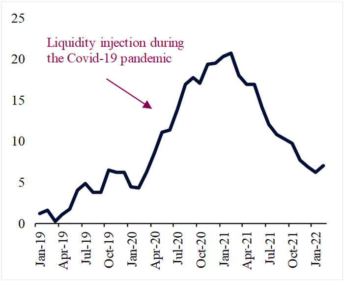 Ensuite , les conditions de liquidité se resserrent, ce qui créera des pressions à la baisse supplémentaires sur la croissance mondiale. Après une période d'abondance de liquidités sur tous les grands marchés, suite aux programmes de soutien de la politique de lutte contre la pandémie, le vent commence à tourner, entraînant un resserrement des conditions financières. La croissance de la masse monétaire s'est considérablement ralentie au cours des derniers mois.