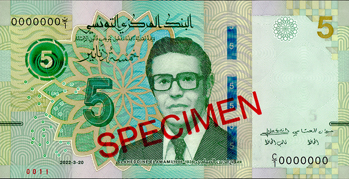 • Filigrane: situé à droite du billet, il représente le portrait de «SLAHEDDINE EL AMAMI» et au-dessous à droite, le chiffre «5», qui apparaissent nettement et en transparence lorsque le billet est exposé à la lumière ;