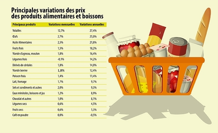 En variation mensuelle, les prix des produits alimentaires augmentent de 2,2%, principalement en raison d’une hausse des prix des volailles (12,7%), des œufs (2,7%), des viandes bovines (1,8%), des dérivés des céréales (1,8%) et des dérivés laitiers et fromages (1,7%).