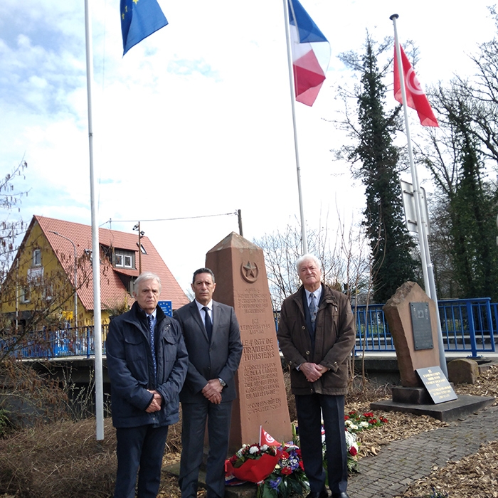 Le souvenir héroïque de l’adjudant- chef Ahmed El Abed, tirailleur tunisien du 4ème RTT et premier soldat à avoir traversé, le 19 mars 1945, la frontière allemande lors de la Libération de Scheibenhard (Alsace, près de Strasbourg), reste vivace. Une cérémonie de commémoration vient de lui être dédiée en présence du consul général de Tunisie à Strasbourg, Abderraouf Mraada, du maire de Gérard Hellfrich, de Mme Odile Chantal Ndongo, déléguée générale de Souvenir Français au Cameroun & Historienne Chercheuse des grandes Guerres de France, et de Néjib El Abed, fils du soldat.
