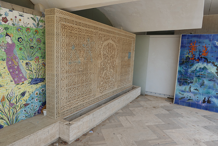 A l’arrière du Palais, un escalier qui mène à la terrasse aménagée sur le toit du premier étage est condamné avec des moyens de fortune peu avenants ; certaines marches présentent des débris qui tiennent à peine. Derrière l’escalier un mur de fond qui, aménagé en angle droit, est décoré de deux superbes fresques composées en céramique par Abdelaziz Gorgi, en 1962, l’année de l’inauguration du Palais. Dans le prolongement de cette œuvre et parallèlement à un long bassin d’eau s’offrent au regard huit panneaux de pierre reconstituée, finement sculptés dans le style ’’Dar Chabane’’ et intercalés avec sept panneaux de céramique d’art exécutés, elles aussi en l’année 1962, par Moïse alias Mouche Chamla qui était le dernier représentant, en Tunisie, de la deuxième génération d’une famille qui avait dès le début du XXè siècle revitalisé la céramique d’art en Tunisie. En exécutant des œuvres très originales, inspirées des miniatures perses, pour le Palais de Skanès, Mouche Chamla, qui travaillait aussi pour le Palais de Carthage était au sommet de son art. Il avait été ’’Meilleur ouvrier de Tunisie’’ en 1936 et ’’Meilleur ouvrier de France’’ en 1955. Ses travaux dans les deux Palais présidentiels font figure de ’’testament artistique’’ signé avant qu’il ne s’installe définitivement en France, en 1966.  A Skanès comme ailleurs, son travail comme celui de Gorgi rappelle que Bourguiba était un esthète qui, conscient de l’étroitesse extrême du marché de l’art, a initié les commandes d’État quelques années seulement après l’indépendance du pays. Accessibles de l’extérieur du Palais, les panneaux de céramique du Palais de Skanès sont exposées aux dégradations et aux incivilités comme en témoignent les carreaux décrochés et les épaufrures qu’on peut y relever. Un coloriage bleu a été infligé à l’un des panneaux de pierre sculptée.