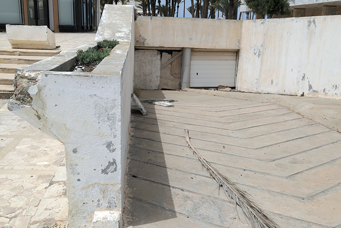 Le visiteur qui aurait l’idée d’admirer le Palais de l’extérieur peut risquer gros. A gauche du musée, une animation particulièrement gênante pour les visiteurs est assurée continûment par les trottinettes électriques et les bicyclettes louées par un club installé juste à côté du musée. Certains loueurs n’hésitent pas à approcher les visiteurs à toute vitesse au risque de les renverser. Celui qui s’avance vers la limite droite de la façade de l’édifice afin de contourner le monument et admirer ses composantes tournées vers la mer bute contre des dépôts de toutes sortes: des restes de matériaux de construction, des gravats et… la carcasse d’un tracteur. A l’arrière du Palais, le faux-plafond du préau décoré pour partie en panneaux de plâtre et pour partie en caissons de bois peint, offre de grandes surfaces décapées, défoncées avec des morceaux pendants et particulièrement menaçants pour les passants. Entre les fresques de Gorgi et celle de Chamla, le visiteur qui oublierait de regarder où il met les pieds pourrait trébucher facilement contre de grosses dalles servant de couvercles de fortune pour des regards de canalisations ou des crevasses. Des voitures circulent, à toute vitesse, sur une piste qu’elles se sont frayée au bout de l’espace vert qui ouvre sur la mer, pour se rendre rapidement de la zone des villas à un café situé non loin de la piscine du Palais. En ce domaine aussi, la sécurité des amoureux du patrimoine n’est pas assurée. Fermer des espaces non sûrs et isoler des points noirs avec des barrières et déblayer tout ce qui peut l’être relève des urgences absolues.
