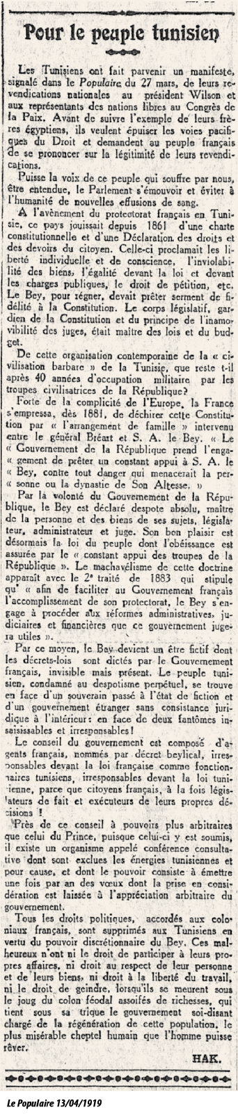 Une note des renseignements généraux mentionne d’ailleurs que Taïeb Sakka – frère d’Ahmed – «a quitté Tunis le 27 septembre 1919 pour se rendre à Paris emportant, paraît-il, un factum intitulé ‘revendications des jeunes Tunisiens’».