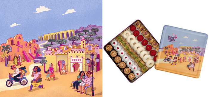 Plus qu’un emballage ordinaire, une œuvre d’art qui marque l’esprit et se conserve. Madame Rekik, pâtissière innovante, renoue, elle aussi, avec la longue tradition d’ornementation des boîtes métalliques utilisées pour les gâteaux, par des illustrations évocatrices. Chacun choisit son axe de communication : la ville, le patrimoine, ou autres. Madame Rekik a eu la main heureuse en choisissant Noha Habaieb, une dessinatrice tunisienne de talent, qui a su épouser l’esprit de la marque et s’inscrire dans son territoire imaginaire, lui donnant des expressions distinctives et attractives.