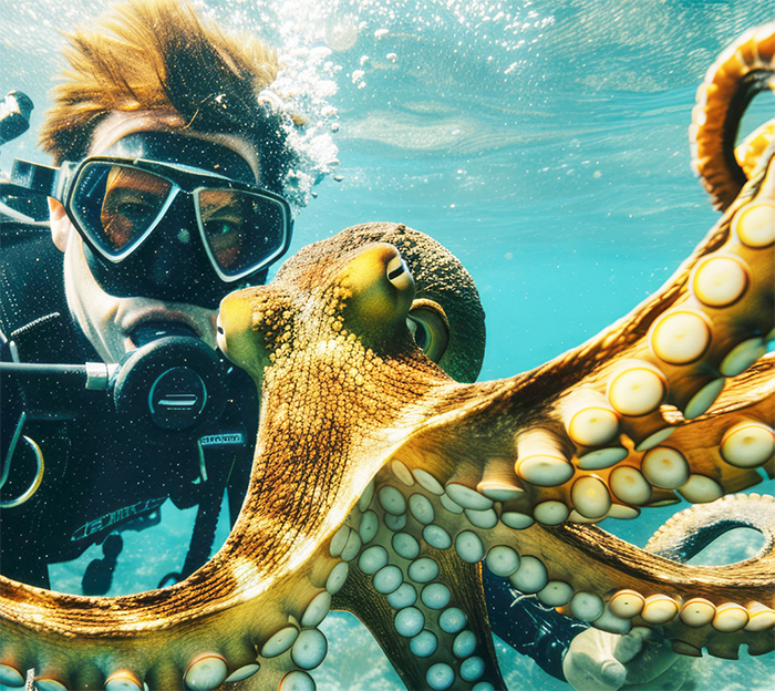Des expériences ont démontré sa capacité à résoudre des problèmes, à mémoriser des situations, à reconnaître des individus et même à utiliser des outils simples. Curieux et joueur, le poulpe explore son environnement avec une étonnante finesse et manifeste des comportements suggérant des formes de plaisir, de stress ou de détresse.