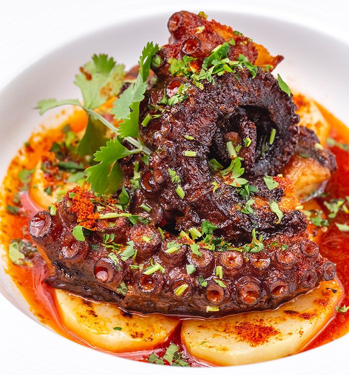 Dans la cuisine moderne et les restaurants gastronomiques, le poulpe est devenu un produit raffiné, apprécié pour sa texture et sa capacité à sublimer les contrastes. Généralement précuit à basse température pour assurer sa tendreté, il est ensuite grillé ou rôti afin d’obtenir une légère caramélisation en surface tout en conservant un cœur moelleux. Les chefs l’associent volontiers à des purées fines, des agrumes, des herbes fraîches ou des sauces à l’encre pour jouer sur les saveurs et l’esthétique.