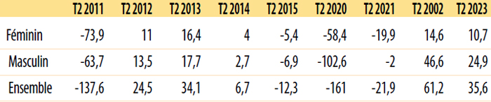 Créations d’emploi par sexe 2011-2023 en 1000