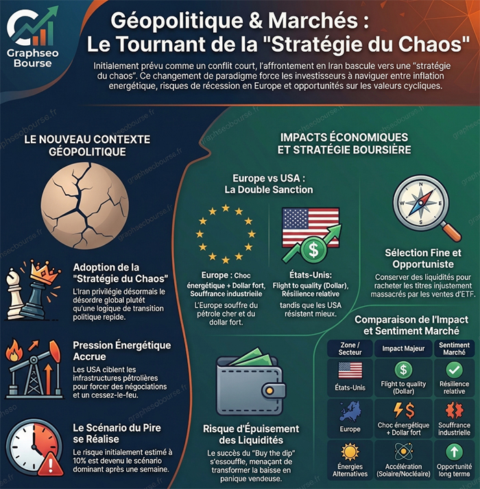 [3] Bloquer le détroit d’Ormuz (infographie: le Golfe, la station-service du monde): c’est devenu une arme de guerre car le détroit possède une capacité de nuisance sur 20% du trafic maritime mondial en dissuadant les navires, avec en filigrane une crise pétrolière possible à long terme (infographie: Géopolitique & Marchés).